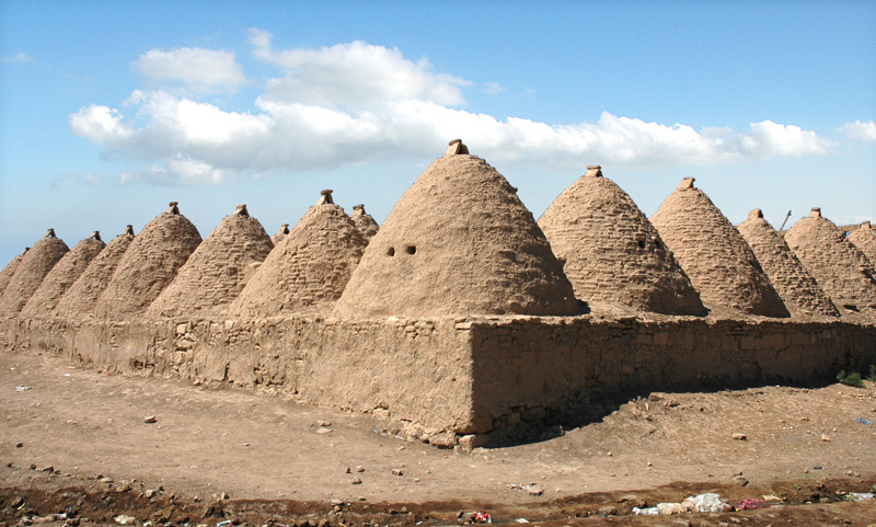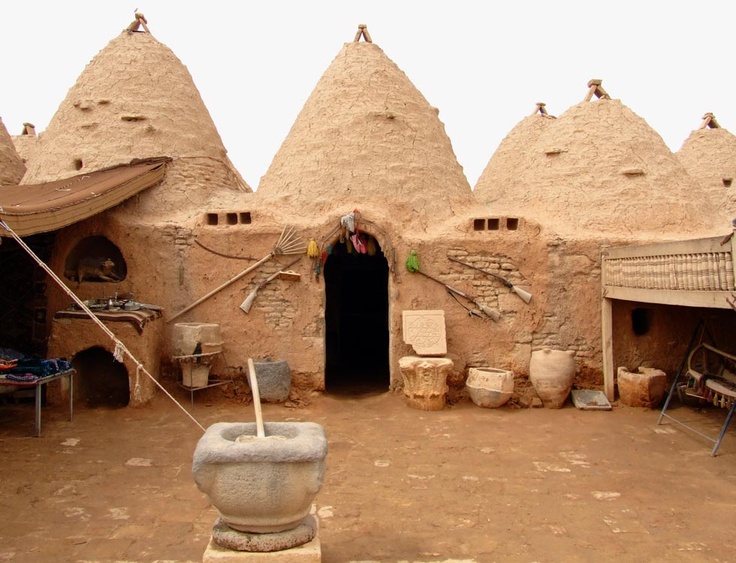 Haran is famous for its traditional 'beehive' adobe houses, constructed entirely without wood. The design of these homes {shape, construction materials of mud-brick, and strategically placed ventilation holes on the walls and ceiling} makes them cool inside (essential in that part of the world) and is thought to have been unchanged for at least 3,000 years. Some were still in use as dwellings until the 1980s. However, those remaining today are strictly tourist exhibits.